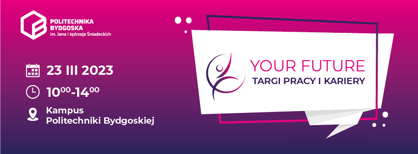 Zapraszamy na Targi Pracy i Kariery – YOUR FUTURE 2023, które odbędą się na kampusie Politechniki Bydgoskiej 23 marca 2023 r. w godzinach 10:00 – 14:00. Na stoiskach będzie można porozmawiać z przedstawicielami firm, służb mundurowych oraz instytucji rynku pracy. Odbędzie się również panel dyskusyjny: „Sektor nowoczesnych usług dla biznesu – możliwości rozwoju zawodowego”. Miasto Bydgoszcz oraz Bydgoska Agencja Rozwoju Regionalnego zostały partnerem wydarzenia.