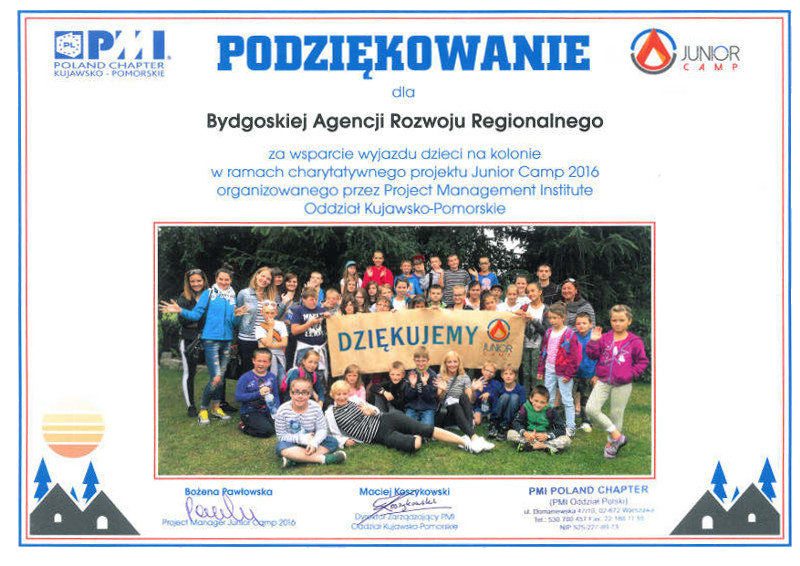 23 sierpnia w siedzibie Bydgoskiej Agencji Rozwoju Regionalnego odbyło się uroczyste zakończenie projektu charytatywnego Junior Camp, w ramach którego dziesięcioro podopiecznych Bydgoskiego Zespołu Placówek Opiekuńczo-Wychowawczych pojechało na obóz nad morze. Bydgoska Agencja Rozwoju Regionalnego była partnerem projektu.