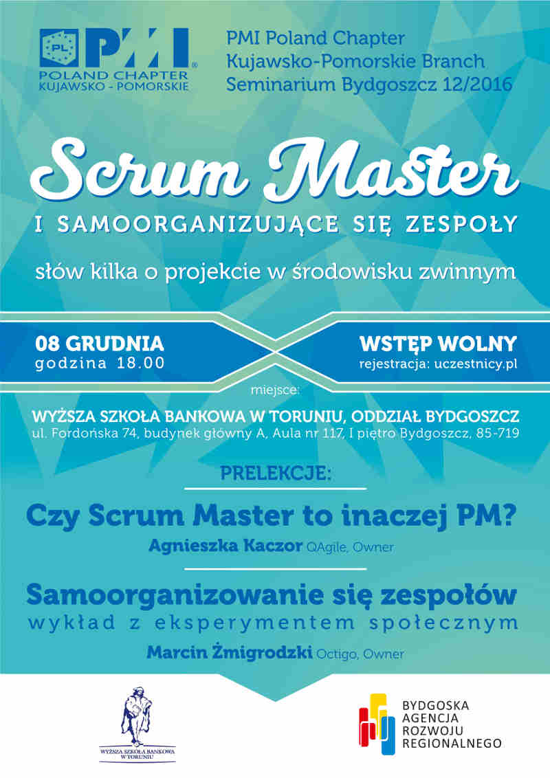 Bydgoska Agencja Rozwoju Regionalnego zaprasza na grudniowe seminarium (08.12.2016, godz.18.00 WSB w Bydgoszczy), którego tematem przewodnim jest praca w środowisku scrumowym. Organizatorem seminarium jest PMI Poland Chapter Kujawsko-Pomorskie Branch. BARR jest partnerem wydarzenia.