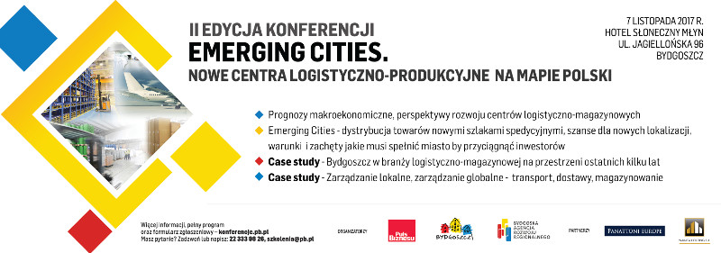 Bydgoska Agencja Rozwoju Regionalnego zaprasza po raz trzeci na konferencję z cyklu „Emerging Cities. Nowe Centra Logistyczno-Produkcyjne na mapie Polski”, organizowaną wspólnie z Miastem Bydgoszcz oraz Bonnier Business Polska, wydawcę dziennika gospodarczego „Puls Biznesu”. Wydarzenie odbędzie się 7 listopada 2017 r. w godz. 11.30 – 16.00 w Hotelu Słoneczny Młyn przy ul. Jagiellońskiej 96.